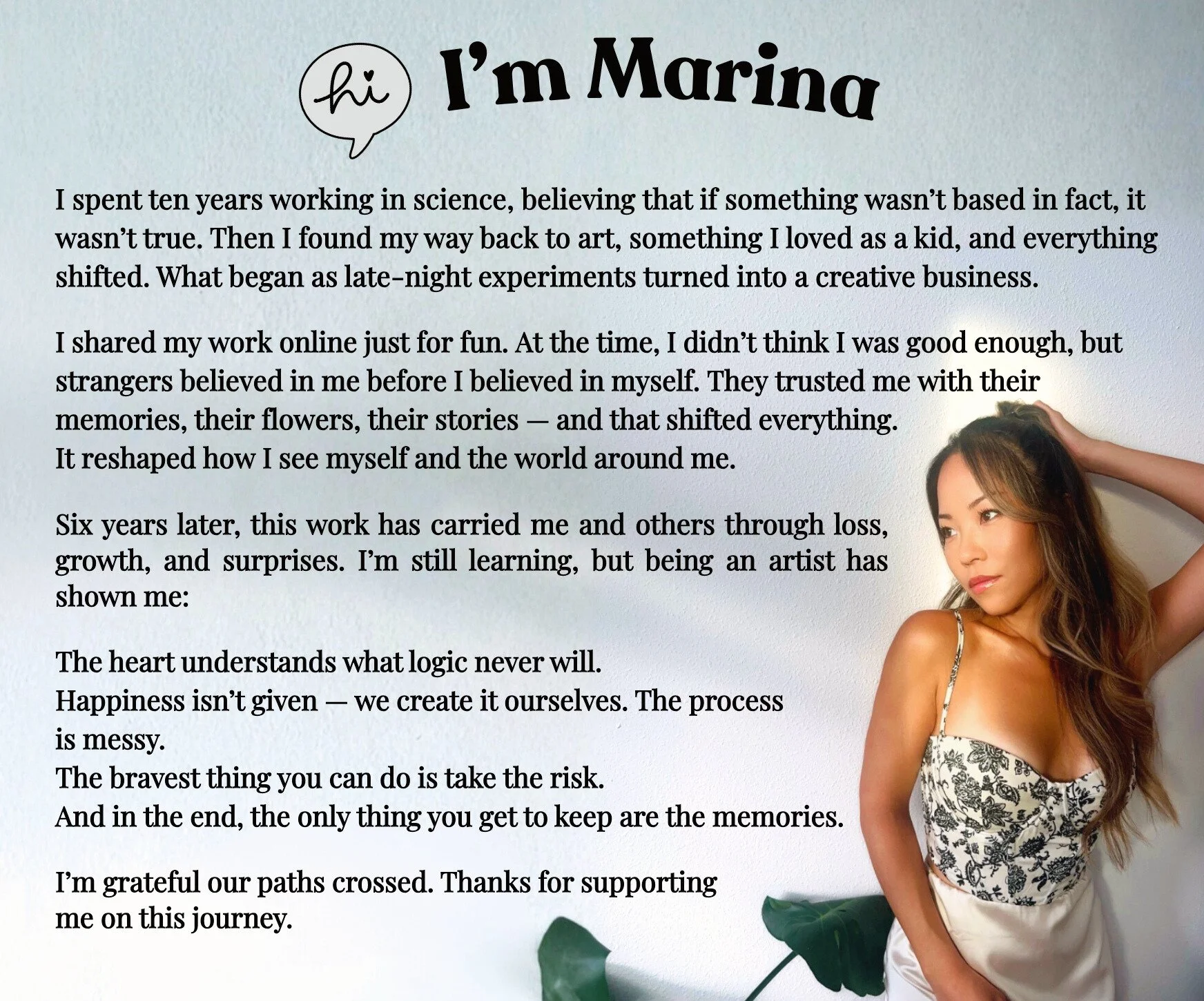 About Me How it started: View this post on Instagram A post shared by Marina Nara | Resin Preservation Artist (@marinamakesart) View this post on Instagram A post shared by Marina Nara | Resin Preservation Artist (@marinamakesart) How it’s going: View this post on Instagram A post shared by Marina Nara | Resin Preservation Artist (@marinamakesart)