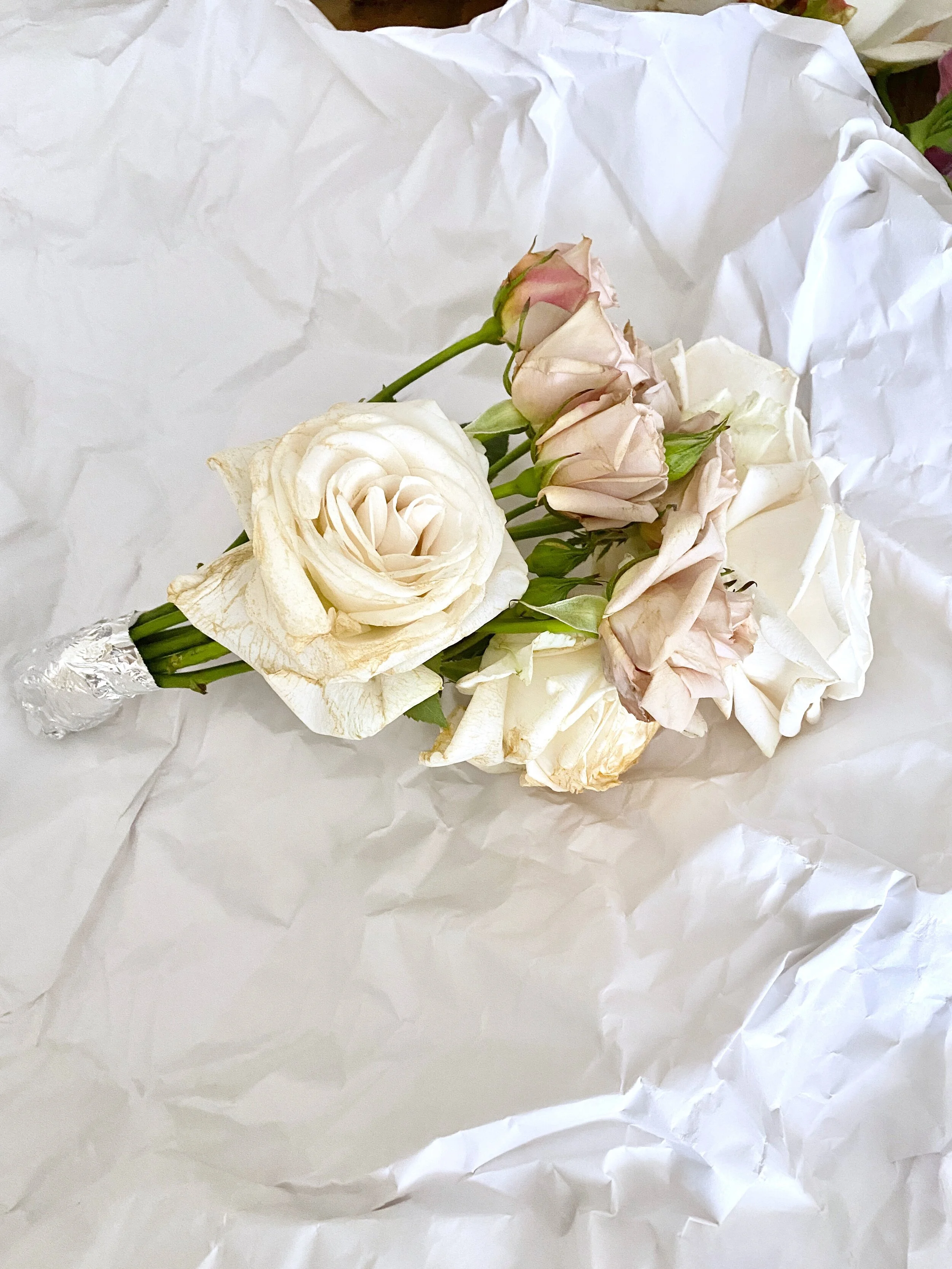 Loosely wrap your bouquet with kraft paper or newspaper. If you have lilies in your bouquet, remove stamens before wrapping.