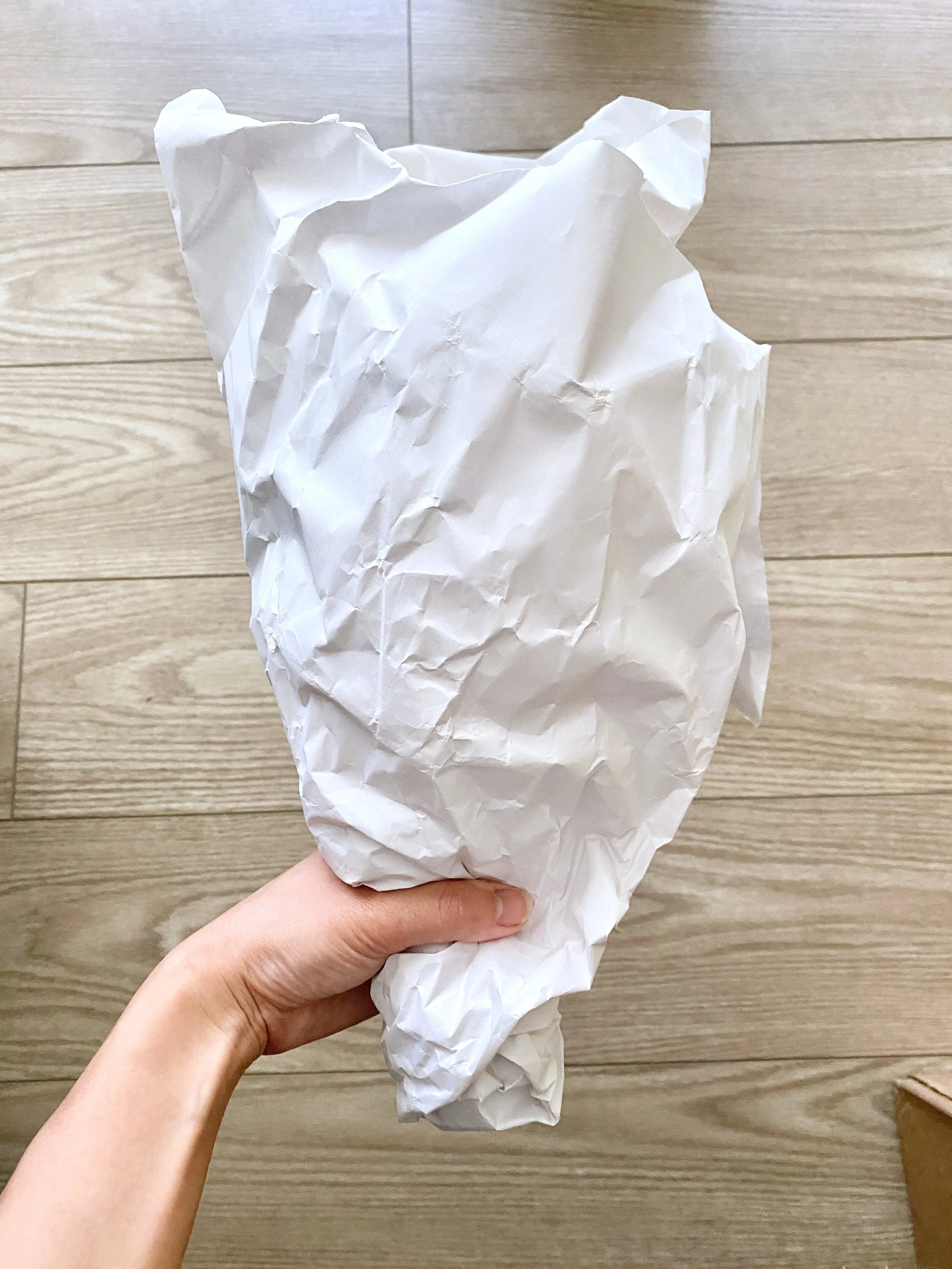Top off with more crumpled paper or styrofoam peanuts to finish off the cushioning of your bouquet.